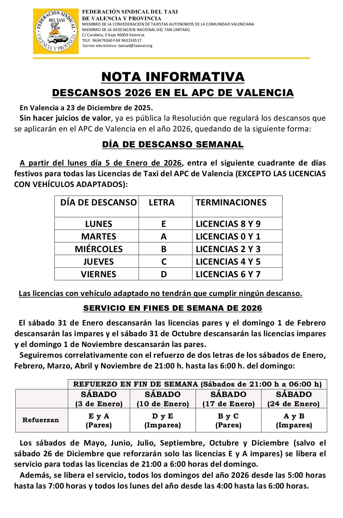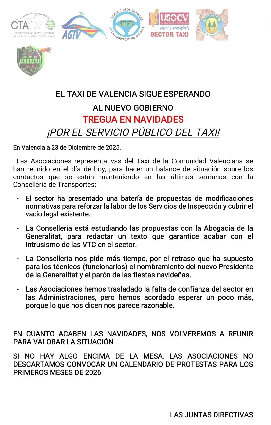 Las asociaciones representativas del taxi de la Comunitat Valenciana han decidido mantener una tregua durante el periodo navideño por responsabilidad con el servicio público, pero advierten de que la paciencia del sector se está agotando. Así lo han comunicado tras una reunión celebrada el 23 de diciembre, en la que se ha analizado la falta de avances reales en los contactos mantenidos con la Conselleria de Transportes.