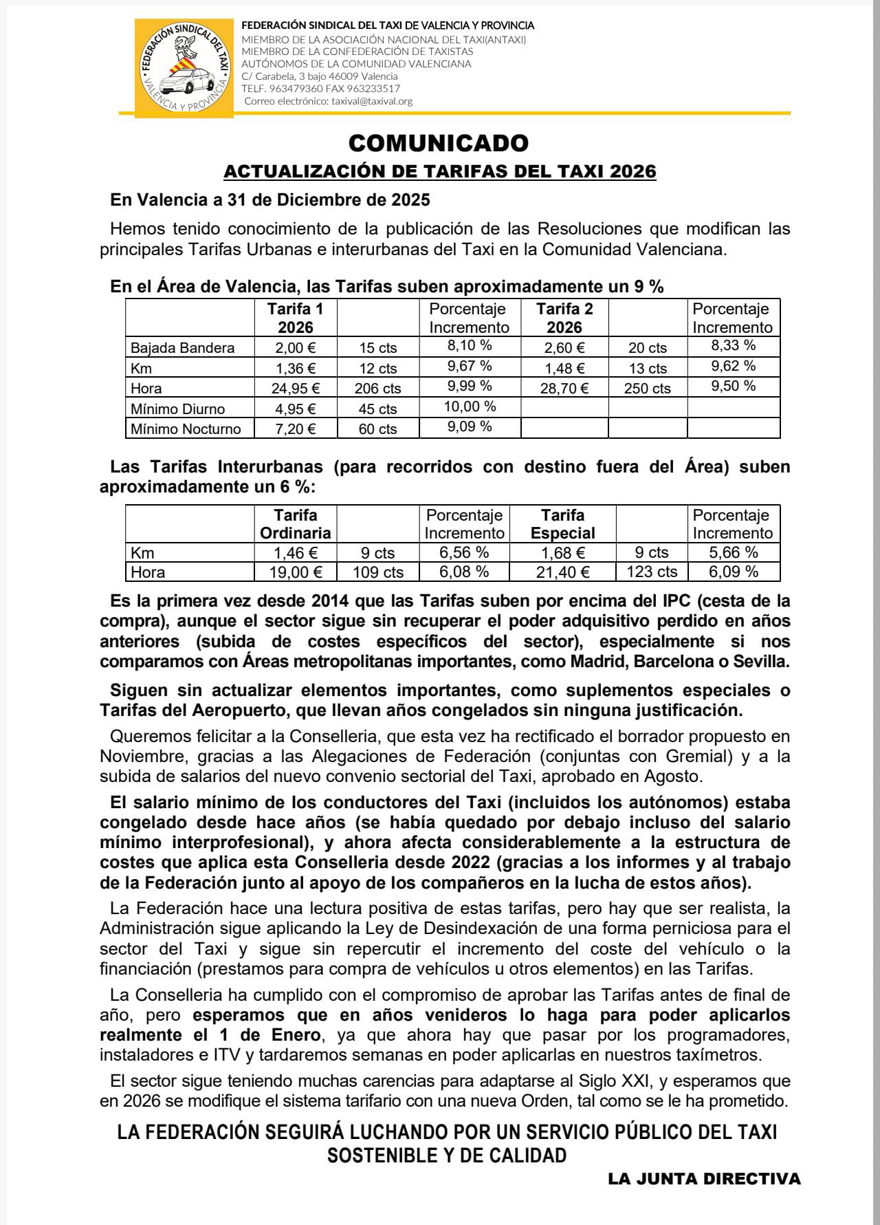 Las nuevas tarifas del taxi para 2026 en la Comunitat Valenciana ya son oficiales. El pasado 30 de diciembre se publicaron las resoluciones que modifican las principales tarifas urbanas e interurbanas, confirmando un incremento medio de alrededor del 9% en el Área de Valencia y de un 6% en los servicios interurbanos.