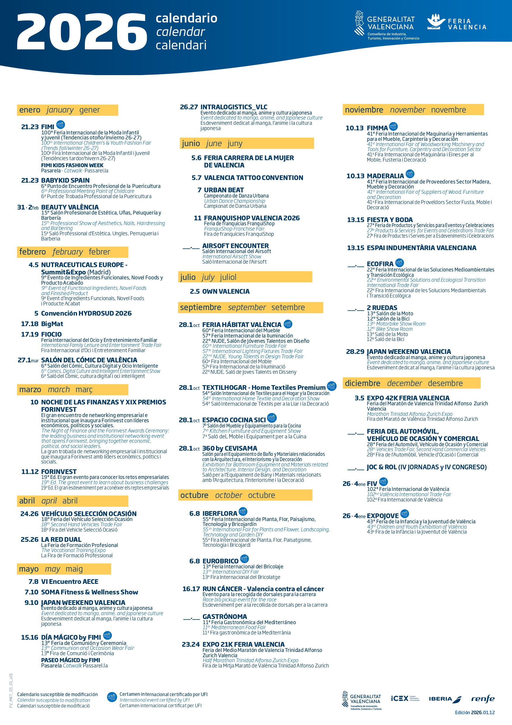 El calendario incluye ferias internacionales certificadas por UFI, encuentros profesionales de referencia y eventos de gran impacto económico y social, como FIMI, Forinvest, Hábitat València, Gastrónoma, Iberflora, Eurobrico o el Salón del Automóvil, además de exposiciones vinculadas al deporte, la cultura, la infancia y el ocio.