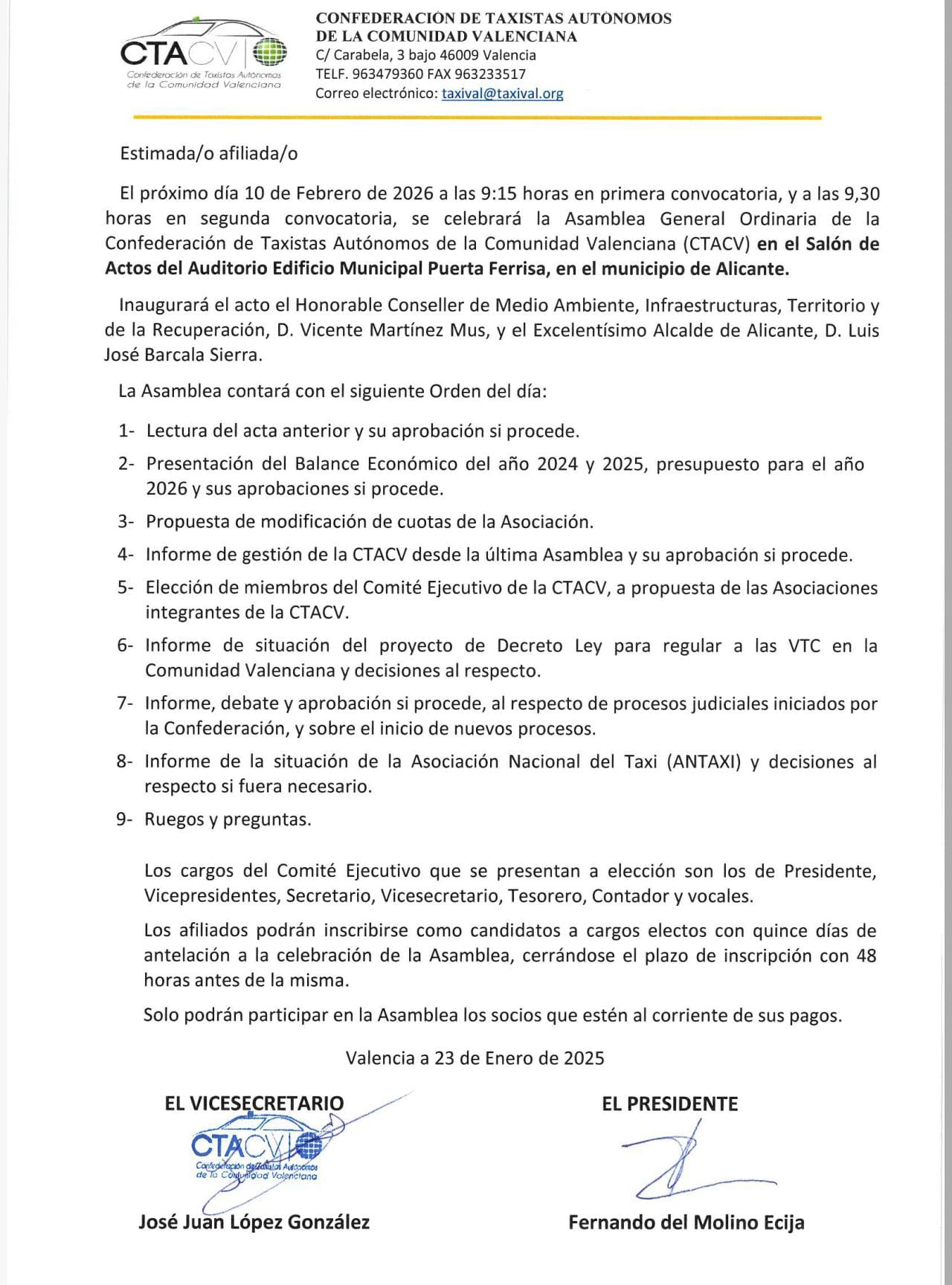 La Confederación de Taxistas Autónomos de la Comunitat Valenciana (CTACV) ha convocado su Asamblea General Ordinaria para el próximo 10 de febrero de 2026, que tendrá lugar en el Salón de Actos del Auditorio del Edificio Municipal Puerta Ferrisa, en el municipio de Alicante. La asamblea se celebrará a las 9:15 horas en primera convocatoria y a las 9:30 horas en segunda.El acto contará con la inauguración institucional del conseller de Medio Ambiente, Infraestructuras, Territorio y Recuperación, Vicente Martínez Mus, y del alcalde de Alicante, Luis José Barcala Sierra.Entre los principales puntos del orden del día destacan la presentación y aprobación del balance económico de los ejercicios 2024 y 2025, el presupuesto para 2026, así como la propuesta de modificación de las cuotas de la asociación. También se abordará el informe de gestión de la CTACV, la elección de los miembros del Comité Ejecutivo y la situación del proyecto de Decreto Ley para la regulación de las VTC en la Comunitat Valenciana.La asamblea analizará igualmente los procesos judiciales iniciados por la Confederación, la posible apertura de nuevos procedimientos y la situación de la Asociación Nacional del Taxi (ANTAXI). El encuentro concluirá con el turno de ruegos y preguntas.Desde la CTACV se recuerda que solo podrán participar los socios que estén al corriente de sus pagos y que los afiliados interesados en presentar candidatura a los cargos electos deberán inscribirse con la antelación establecida en los estatutos.